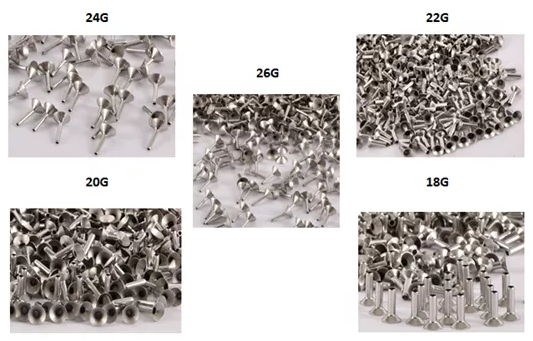 鉚釘選用進口不銹鋼材料,進行伸拉成型制作,具有優(yōu)異的耐腐蝕性和尺寸穩(wěn)定性,產品的表面粗糙度,內外公差需精密控制,外直徑導向位和擴口導向位需符合標準通用尺寸及組裝需求,鉚釘現(xiàn)有規(guī)格:18G、20G、22G、24G和26G。